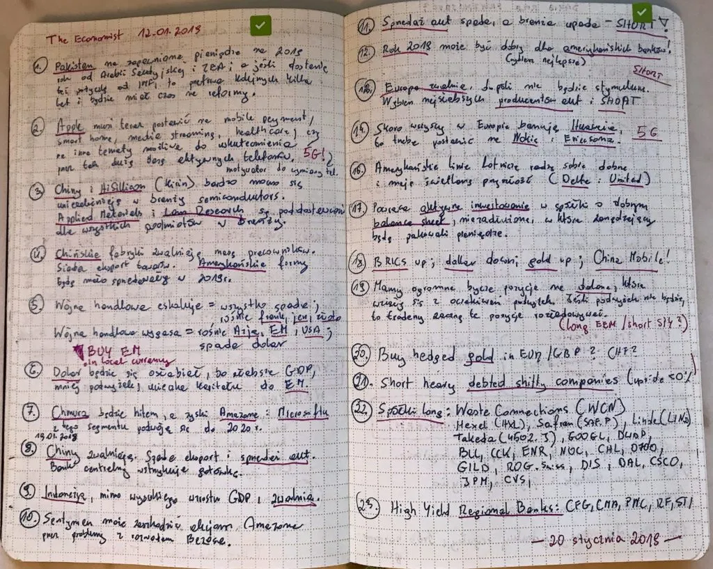 Zapisywanie prostych wniosków czy jednozdaniowych obserwacji przy użyciu własnego języka pomaga mi uporządkować chaos informacyjny. Pomysły inwestycyjne nie powstają w trakcie przyswajania wiedzy, tylko w trakcie jej późniejszego przetwarzania. Ludzki umysł nie ma zdolności uczenia się w sposób pasywny (poprzez samo czytanie), tylko w sposób aktywny.