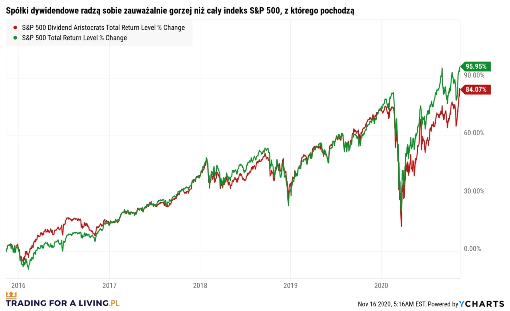 Jeśli do kogoś jeszcze to nie dotarło, to może sytuację lepiej pozwoli unaocznić wykres tego, jak spółki dywidendowe zachowują się względem benchmarku, czyli całego indeksu S&P 500, z którego pochodzą. Parametr total return oznacza, że wzrosty uwzględniają już wypłacane i reinwestowane dywidendy.