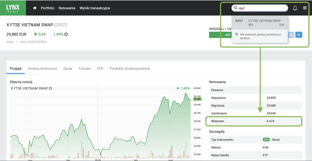 Znając już dostępne możliwości i odpowiedni ticker z interesującej nas giełdy, możemy teraz odszukać instrument na platformie brokerskiej.