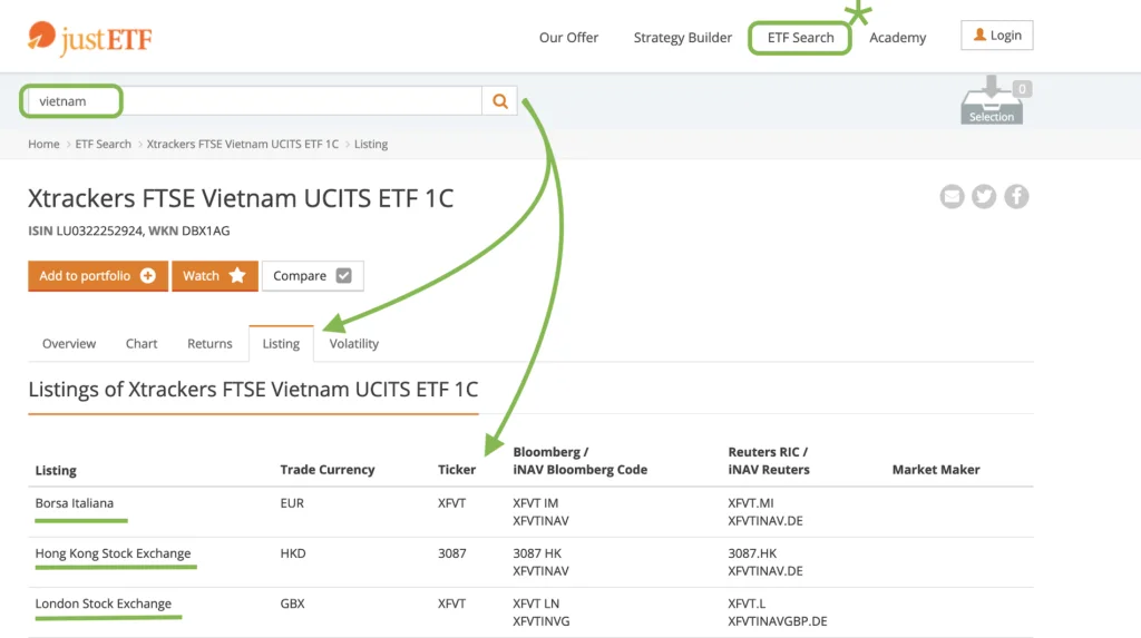 Po przełączeniu zakładki na „Listings” można z kolei podejrzeć, na jakich giełdach i w jakich walutach notowany jest ETF oraz jaki jest jego symbol giełdowy na danym parkiecie. W jednego ETF-a można bowiem zainwestować za pośrednictwem wielu różnych giełd z całego świata. Zupełnie tak samo jak w akcje dużych spółek notowanych równolegle w różnych krajach.