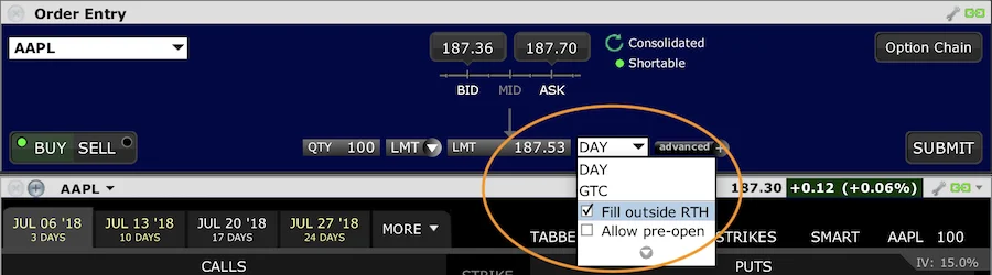 Żeby dokonać transakcji w pre-market lub w after-hours na platformie Interactive Brokers/LYNX należy w okienku zleceń w zakładce „Day” zaznaczyć opcję: Fill outside RTH (zrealizuj poza regular-time hours) lub Allow pre-open (dopuść w pre-market). Różnica jest taka, że pierwsza wersja dopuści zawarcie transakcji na długo przed otwarciem i po zamknięciu rynku (od 10.00 do 2.00 naszego czasu). Druga możliwość pozwoli nabyć akcje na otwarciu kolejnego dnia w giełdowej fazie pre-open (trwającej od 15.00 do 15:15), która ma na celu zebranie zleceń od inwestorów, aby ustalić cenę otwarcia kursu akcji.