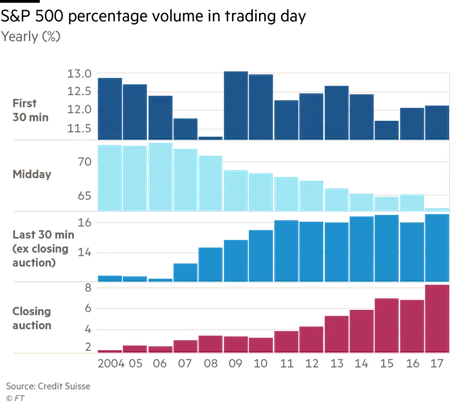 Sytuacja ta na przestrzeni ostatnich lat wygląda coraz gorzej i dziura w trakcie dnia ciągle się pogłębia. Dzisiaj aż 40% handlu odbywa się tylko w ciągu pierwszej i ostatniej pół godziny giełdowej sesji.