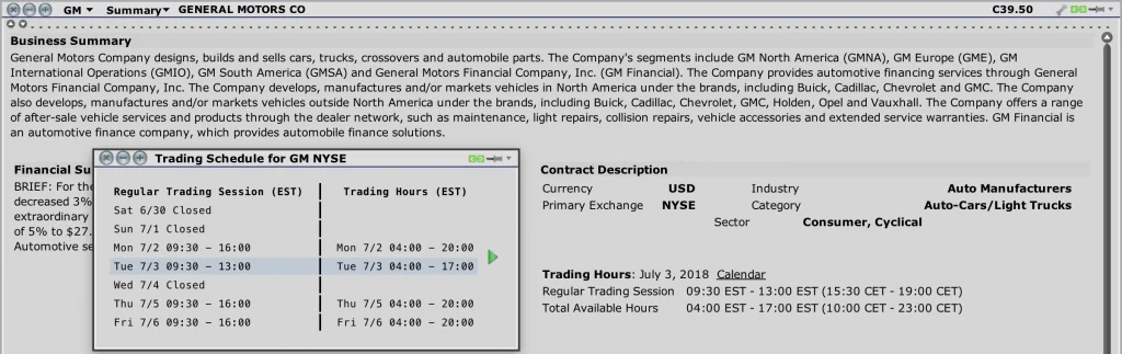 Natomiast to, czy danymi akcjami można w ogóle handlować w rozszerzonych godzinach, da się sprawdzić w okienku New Window -> Fundamentals -> Company Overview. Na screenie poniżej widać dzisiaj skrócone godziny handlu z uwagi na jutrzejsze święto 4 lipca.