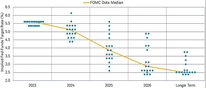 W przypadku końcówki roku 2023 członkowie FED-u są dość zgodni – 7 kropek uważa, że stopy procentowe na koniec roku zostaną ustalone na średnim poziomie 5.37%, a 12 kropek, że na średnim poziomie 5.62%.