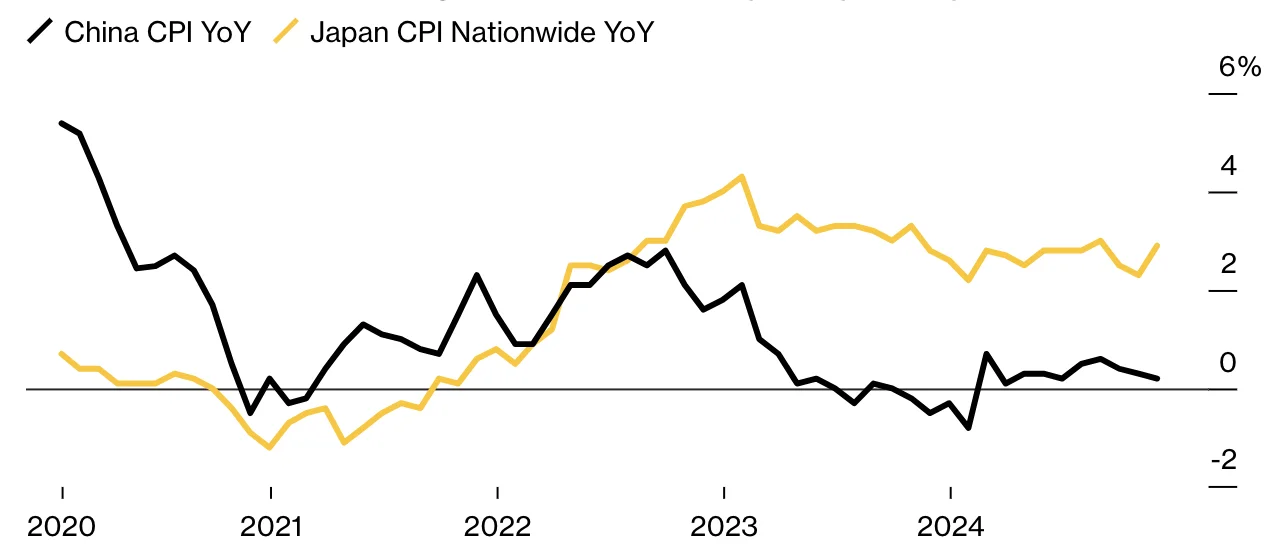 Zamiana ról? Wielu ekspertów uważa, że Chiny wkraczają na wieloletnią ścieżkę deflacji i rozpoczynają swoją „straconą dekadę,” podobnie jak lata temu Japonia, która… zaczyna odżywać